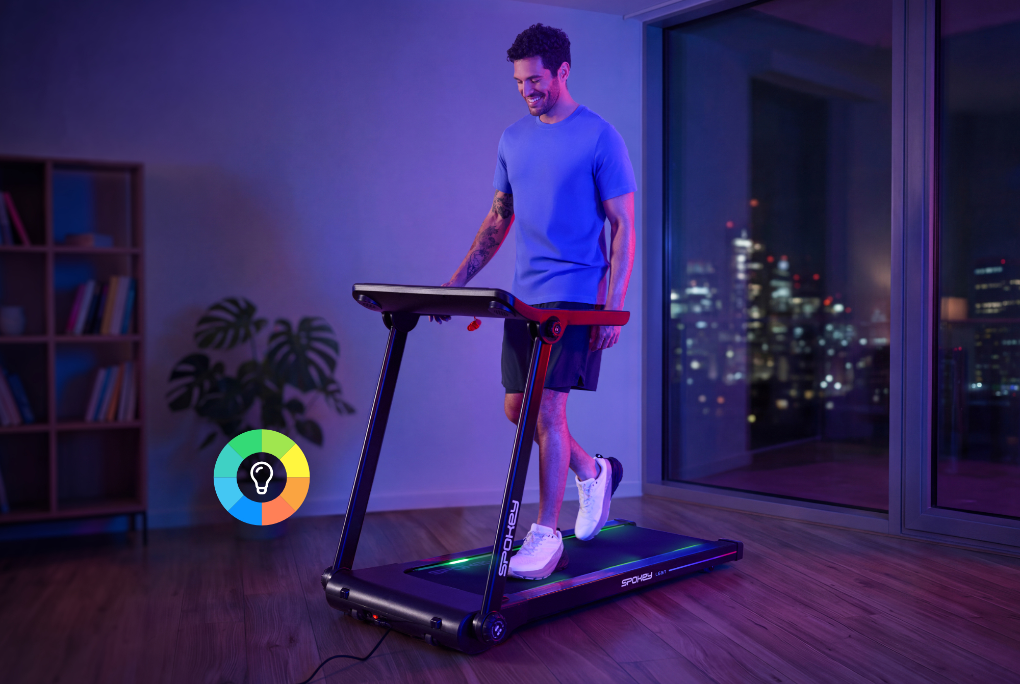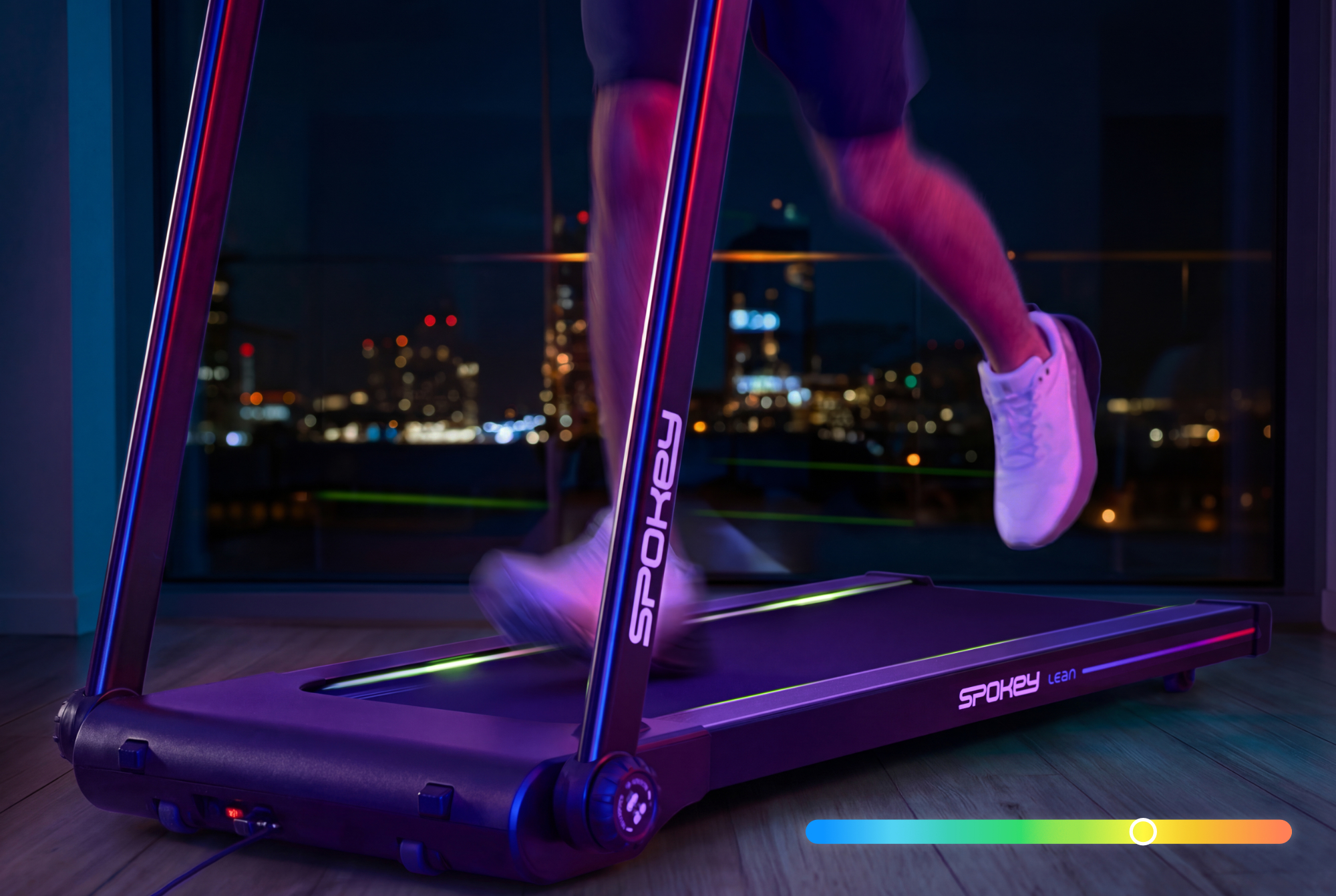 - Běžecká plocha s dynamickým LED podsvícením: Běžecký pás má barevné podsvícení, které dynamicky mění barvu v závislosti na rychlosti běhu. Je to zajímavé zpestření, které dodá energii a zajistí jedinečnou atmosféru při každém tréninku.