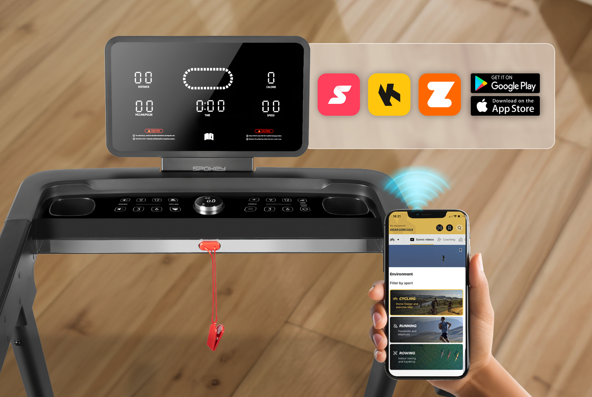 Běžecký pás Spokey SIRIUS je vybaven rozhraním Bluetooth, díky kterému jej můžete propojit s oblíbenými tréninkovými aplikacemi - Kinomap, Zwift a Spax.